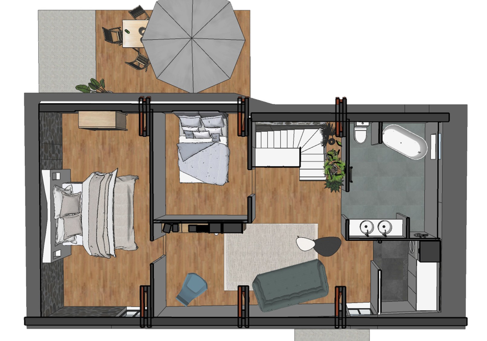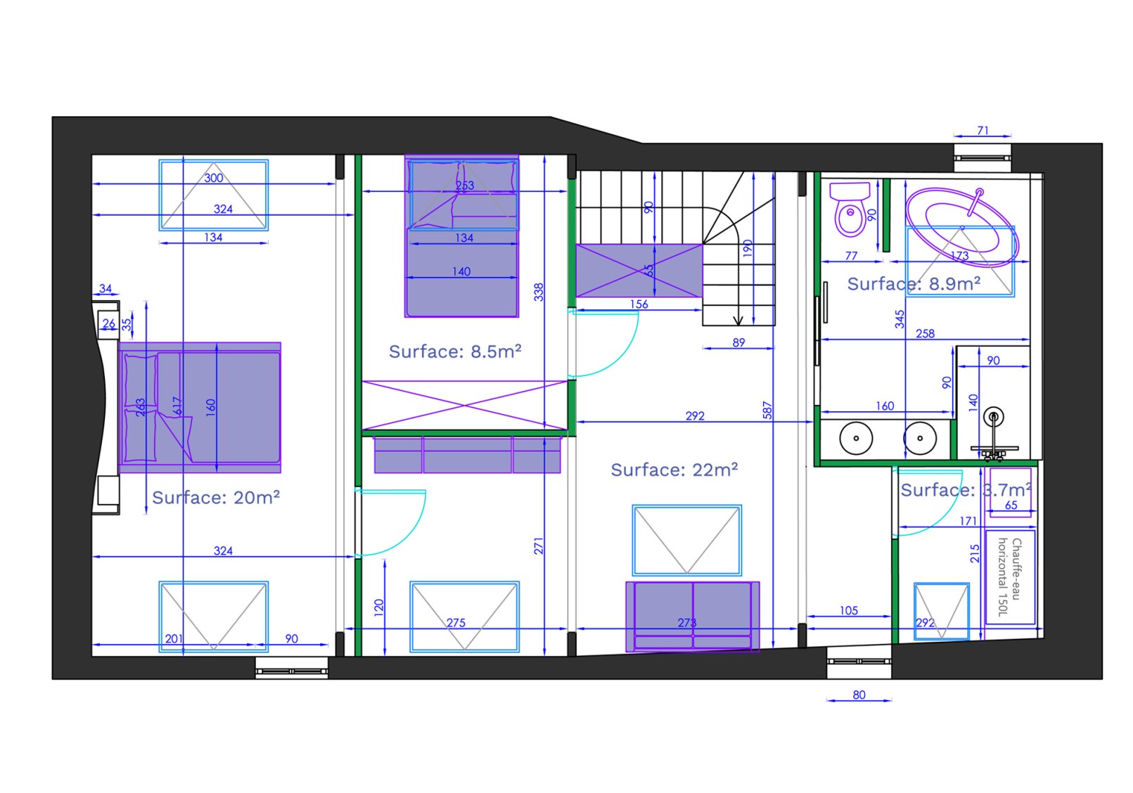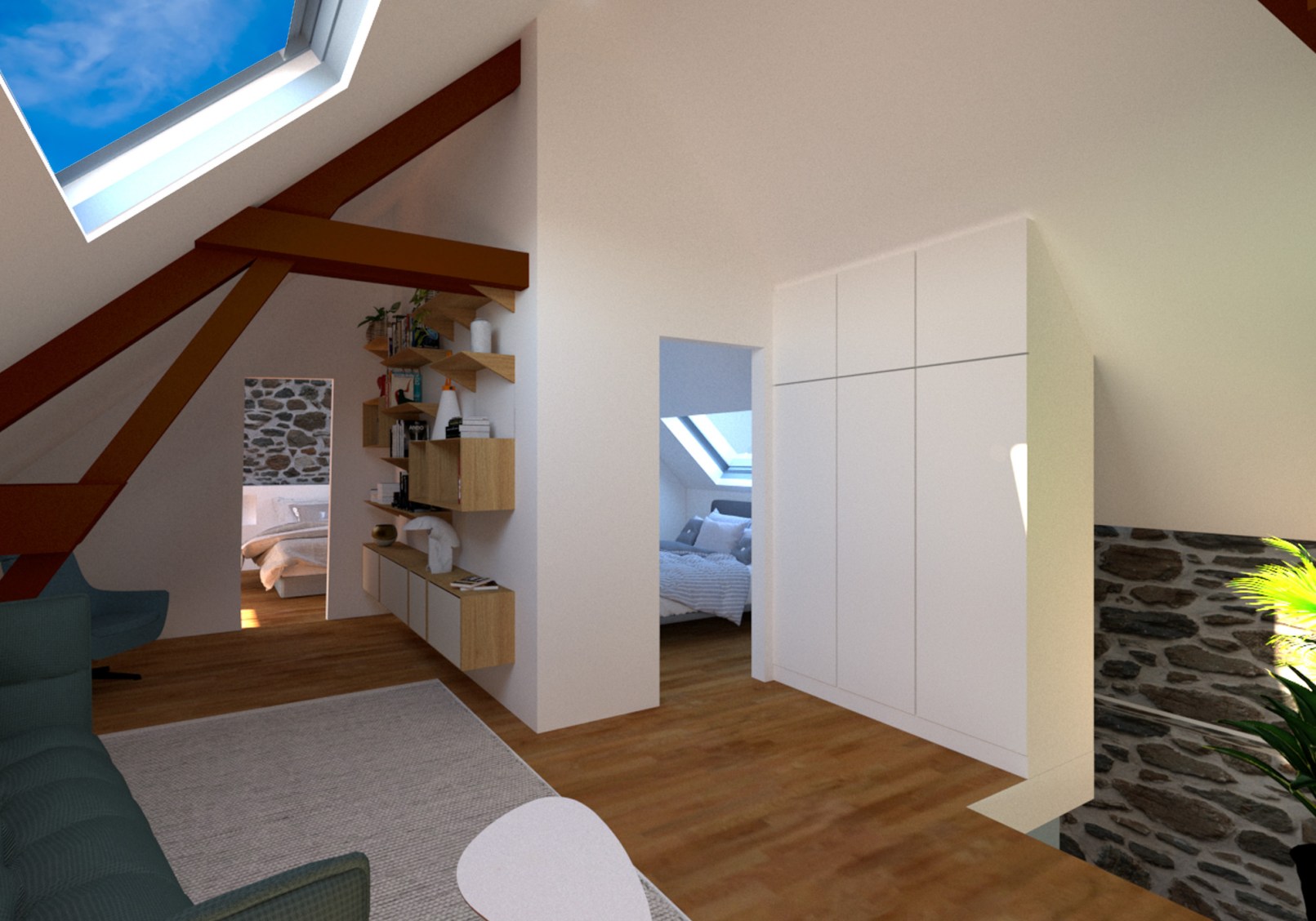 L’étage s’articule autour un grand espace de détente avec canapé et bibliothèque. Il dessert deux chambres une salle de bain avec wc et une lingerie.