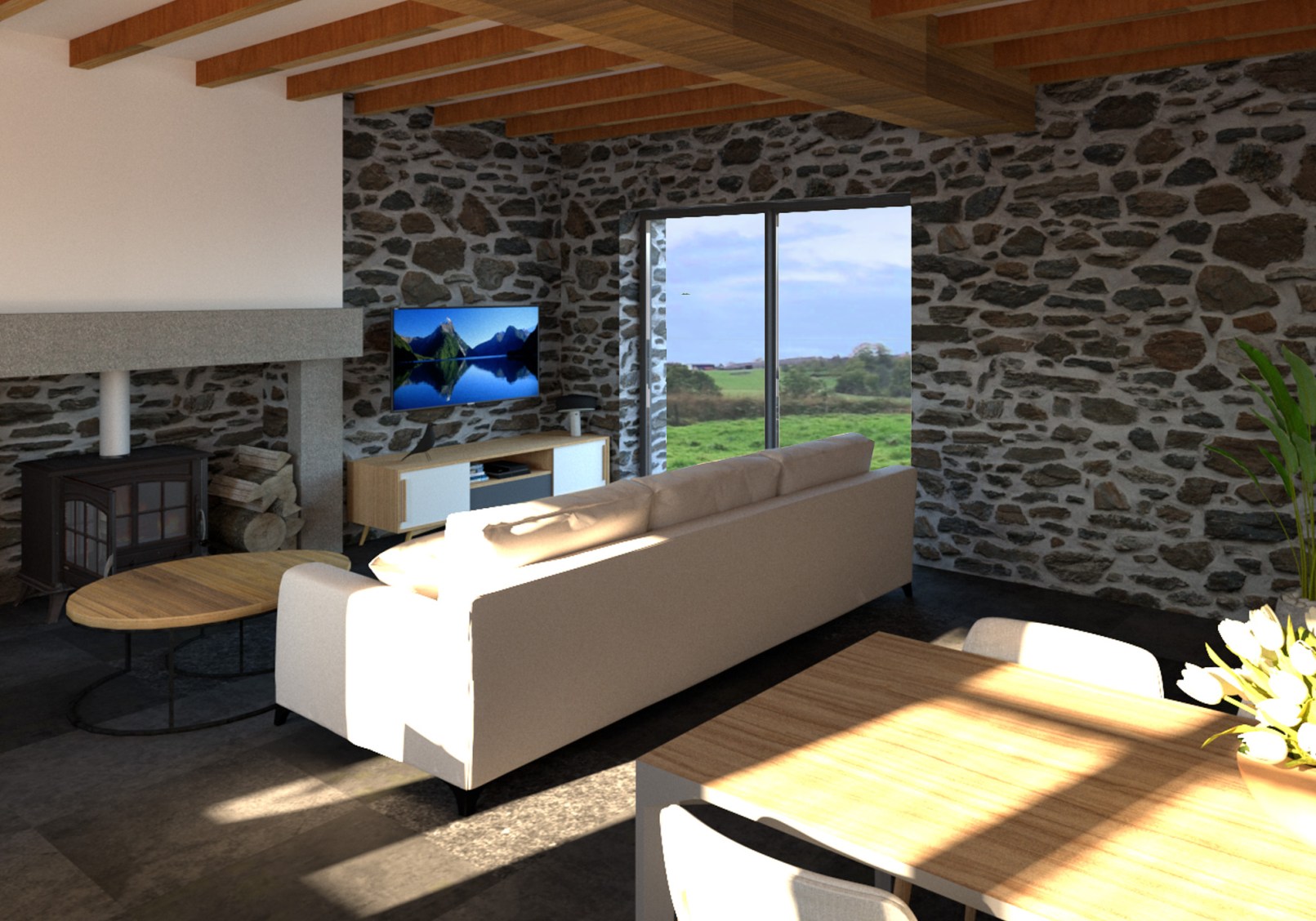 La réalisation : Le rez-de-chaussée de cette maison devait pouvoir accueillir une personne en fauteuil roulant. Il devait donc regrouper toutes les fonctions de vie avec la cuisine, la salle à manger, le salon, une chambre et une salle de bain avec wc. La pièce de vie principale conserve ses points forts d’origine comme les poutres et pierres apparentes ainsi que la cheminée pour l’ambiance de la ferme.